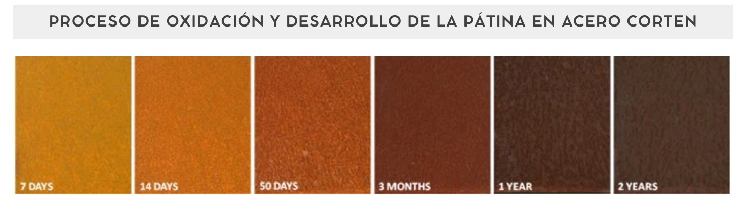 La capa protectora del acero corten se forma gradualmente entre los 6 y 24 meses, dependiendo de las condiciones ambientales. Este proceso de oxidación controlada genera tonalidades que van del naranja al marrón oscuro, creando una superficie estable y estética que protege al acero sin necesidad de mantenimiento adicional.